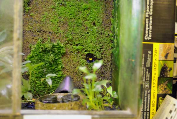 アイゾメヤドクガエル‘ブラジル'(Dendrobates tinctorius 'Brazil'デンドロバテス・ティンクトリウス‘ブラジル')がヤシパネルを引きちぎって設けた洞穴から、猟場を見張っているところです。いつもこの洞穴に居て、エサをまくと地上にジャンプします。同じ個体がいるのか、複数の個体が入れ替わっているのか、それはわかりません。このは8年前に当時はとても珍しかった「ラマシー様用にセット」とか言って、フィッシュマガジンに載せたビバリウムです。あれから8年、ラマシーが入荷する機会も多くなりました。