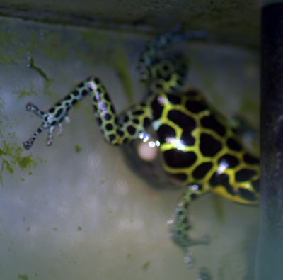 レティキュラタスヤドクガエル Dendrobates reticulatusがオタマジャクシを運搬中の様子です。この画像はオランダの友人ルドが昨年ペルーに行ったときのものです。502点も画像を送ってくれたので、ワイルドスカイ店内にあるパソコンで見ていただけるようにします(4月25日から)。レティキュラタスの他に、イミテーター各種、バリアビリス、ウアカリやミステイオゥサスとか他にもいろいろ写っていますので、ぜひ見に来てください。ルドとは11年くらいつきあいがあって以前はブリーディングもやっていたのですが、いまはビバリウムをつくってます。2008年04月20日