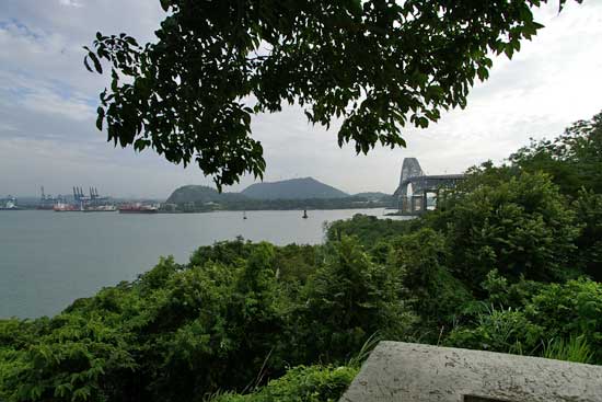 上の画像の反対側(山の裏側)から見た様子。パナマ運河を渡った後、振り返ると見える風景です。写真を撮ったこの場所には自動小銃を担いだ兵隊さんが二人立っていました。写真は撮っても大丈夫のようです。