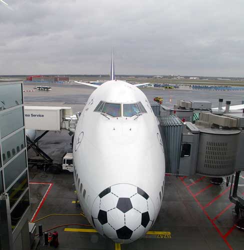 ドイツでサッカーワールドカップがあったのは何年前でしたっけ。その開催中に乗った飛行機は、先っぽがこんな感じで、搭乗記念にサッカーボール模様のピンバッジもらいました(どっかいっちゃったけど・・・)。