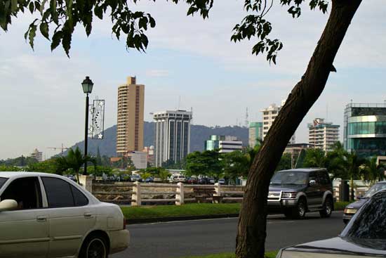 オーラタス‘パナマ'の生息地の丘がパマナシティー中心部の向こうに見えています。高層ビルより高いけど、小さな山です。
