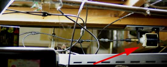 ワイルドスカイ店内のミスティングシステム設置の様子です。赤い矢印の先がポンプです。高い水圧をかけるため耐圧チューブの振動し、あちこちにあたって打撃音がします。ワイルドスカイのようにチューブむき出しだと、けっこう賑やかです。