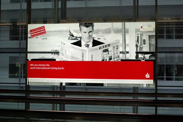これはミュンヘン空港の国際線から国内線への連絡通路にあった大きな看板です。画像を縮小して見えないと思いますので補足すると、新聞一面見出しは「強風日本上陸」「独の旋風」と書いてあります。この看板のスポンサーは新聞社ではなく、ドイツのsparkasseという銀行(たぶん)です。新聞裏面には「ビジネスチャンス」の見出しが見えています。この看板を見て、ドイツが日本をいまでもライバル視していることが伺えて、うれしくなりました。先週末滞在中には、ビール会社のテレビCMで日本語を聞きました。ビアホールに日本人が来て「こんにちは、この地方の特産品をお願いします」とオーダーすると、隣の席のドイツ人がドイツ語で何か言ったあと、スポンサーのビールが出てきます。ドイツ人が何を言っているの理解できない私は平和ボケですが、日本という国を身近に感じている国があることがうれしかったです。