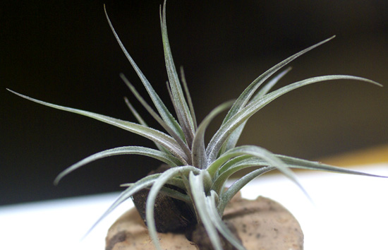 この画像はティランジア・アエラントス‘ミニパープル'です。品種名の由来は、普通のアエラントスより一回り小型のうちに成熟して開花することと、葉の根本付近が紫色に色づくことから来ているようです。アエラントスは複数の花が同時に咲き、ショッキングピンクの額も大きく目立つので開花時に美しいです。この画像の株はまだ未熟で、葉っぱが細いです。大人のアエラントスの葉はもう少し幅広で、硬くて力強い感じになります。