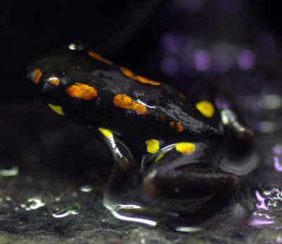 この個体がワイルドスカイでお客さんを待っていた時期から比べると、ずいぶんと立派な体格に成長しています。指先の広がっている部分を「フィンガーパッド」と呼びます。ティンクトリウス(アイゾメヤドクガエル)のオスは、メスよりもフィンガーパッドが大きくて、雌雄がわかりやすいのですが、‘オイヤポッキ'は雌雄の差が小さくわかりにくいモルフ(形態=外見の違いにより種を細分化すること)です。それで、この画像の個体が雄か雌かと聞かれると悩みます。‘オイヤポッキ'ではないティンクトリウスなら即座にメスと答えます。でも、‘オイヤポッキ'の場合は「メスのような気がする」と曖昧な答えになってしまいます。そういう場合は、複数の個体を比較して判別します。