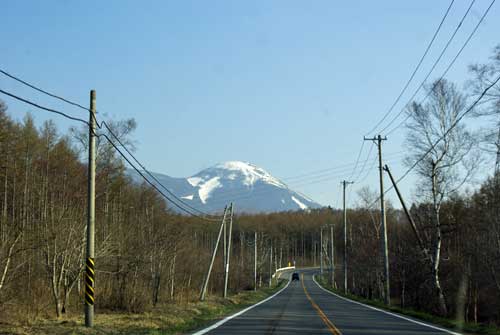 右画像は蓼科山です。沿道の白樺並木に若葉がつくのは、もう少し先のようです。