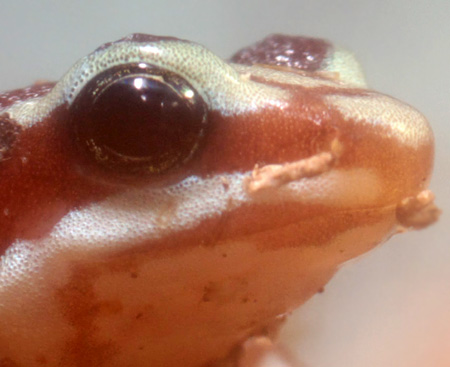 頭部はファンタスティクスみたい、下半身はレティクラタス、これハイブリッドではないようです。ヤドクガエルに詳しい人が見たら、いったい何なのという感じの不思議な模様と思います。そして、肉眼で見ているときには気がつかなかったのですが、背中に赤いスポットも見えています。他の個体にも赤いスポットがあったりするのか、他個体の写真も確かめてみようと思います。