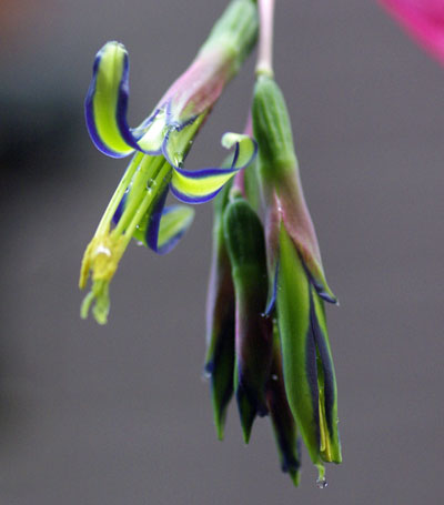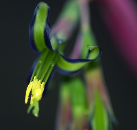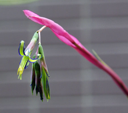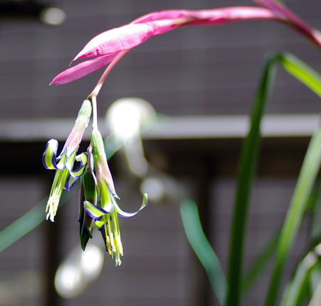 ビルベルギア・ヌタンス(ブラジル)が一昨日から咲きはじめました。写真を撮る前に水をかけちゃったので、おしべがへんな形になってしまいました。この鉢はもう5〜6年くらい前から店の裏にほっぽりぱなしで、冬の間は日光にあたることもなく雪にもめげずがんばっています。こんな悪条件で葉っぱの幅が1cmくらいしかないかわいそうな姿になってしまいましたが、毎年春にきちんと花ひらきます。この画像は昨日の姿です。今日は二輪目がが咲いています。今年は肥料と太陽を十分補給してあげたいと思います。