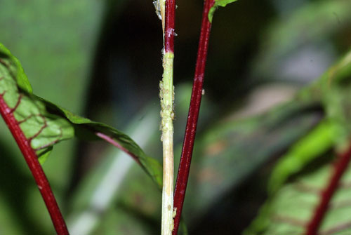 数日前から、店内にあるルメックス・サンギネアにアブラムシがついています。画像に写っている全部同じ種類と思われますが、体色が黄緑、緑、薄茶の3色もあります。どれも半透明です。緑のやつは青汁吸い過ぎですかね、それとも羽が生える間近だからでしょうか・・・、私は知りません。