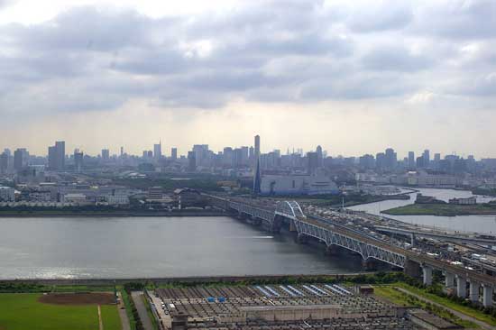 荒川を隔てて、東京都心方面。晴れていたら富士山も見えたでしょう。橋は湾岸高速とJR臨海線です。