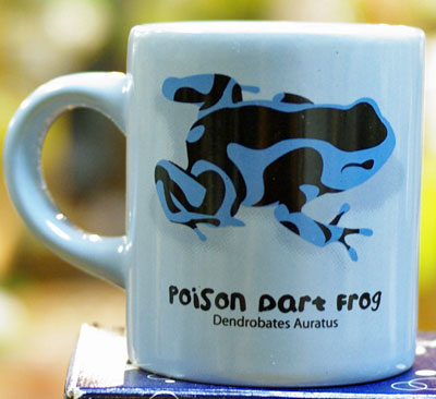 。オーラタス‘ブルー’(マダラヤドクガエル‘ブルー’)のマグカップです。マレーシアの水族館(動物園だったかも)に行った方にお土産でいただきました。スカイブルーの地がすごくきれいで、ワイルドスカイのホームページの色にも似ているし、カエルの色もリアルな感じです。その水族館にオーラタス‘ブルー’がいるんだそうです。200ccくらいの大きさで、濃いコーヒーにぴったりです。このくらいのサイズにスプーン3杯の粉(インスタントコーヒー)とグラニュー糖とクリープ(粉がベスト)を入れて飲みます。だいぶ昔のことになってしまいましたが、フロリダキーズで飲んだカフェ・コン・リッチ(砂糖とミルクが入ったコーヒーという意味)を目指しています。エスプレッソマシーンを買えばもっと美味しくできるかなとも思いますが、後かたづけがめんどくさそうで、インスタントならカップ洗うだけですから2008年05月18日