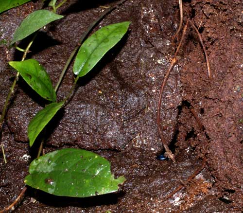 ピートブロックに水を含ませて積み上げた一番下の隙間からオーラタス‘ブルー’(マダラヤドクガエル‘ブルー’)が顔を覗かせている様子です。水を含ませても形を保っているピートブロックはビバリウムのレイアウトをつくる際に便利です。柔らかいので手で形を整えることもできます。ただ、ミスティングなどで長期間水がかかり続けると、やっぱり少しずつ浸食しいてしまいます。しかし、盛り土よりは長い期間形を保ちます。この使用目的では、ヤシガラブロックも候補にあげられますが、私の知る限りではピートブロックほど長持ちしませんでした。ビバリウムの中に山をつくったりする目的では、いまのところピートブロックに勝る自然物は無いかなと思っています。