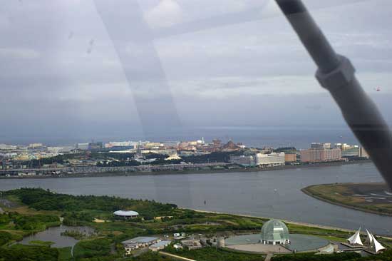 上の画像の反対側、千葉県方面。手前に見えるのは葛西臨海水族園のドームです。地上に建物が無く、水族館が地下にあるのがよくわかります。その向こうはディズニーランドです。ただいまワイルドスカイの店前にも名前はわかりませんが、クローバみたいな植物が黄色い花を咲かせています。ご来店の折、お時間ある方は四つ葉を探して見てください。見つけたら、ご自由に摘んでけっこうです。